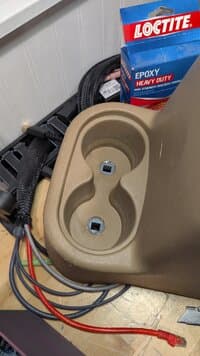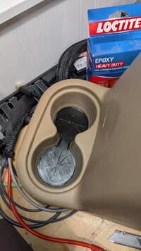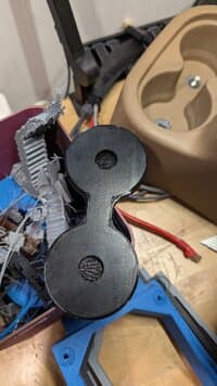 The whole center console is kind of getting revamped. The nutcerts in the floor that hold the back of the console started to spin so I had to drill them out and replace them, and had to use a much larger nutcert to fill the hole left in the floor. Also, getting the nuts out mangled the rear cup holder, so I had to fix that with a printed part that I used epoxy to attach to the bottom of the console. The metal bracket for the sub is not strictly necessary for me since I removed it, but I figure I may use it at some point, so I modeled the repair to include it. With the larger bolt sticking up more into the cup holder area I also had to replace the little rubber base of the cup-holder to allow more clearance for the screw head.
