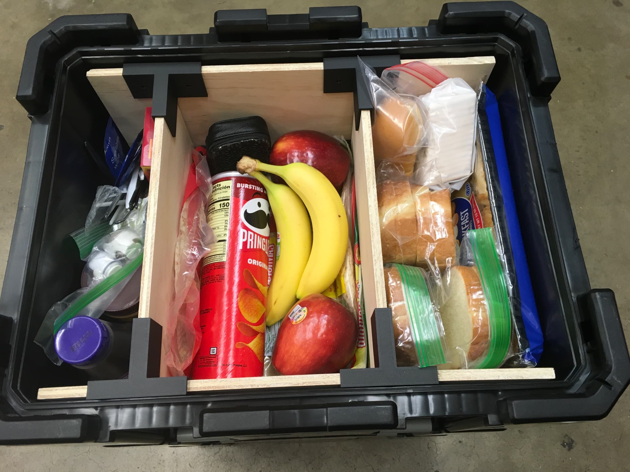 Open ↗Not exactly for my Jeep but for use with it. Let's call it Jeep adjacent. Last weekend I was headed out on a 3 day camping trip in Death Valley and hate it when my bread and bananas get squished. I made these quick brackets to be a snug fit yet movable.