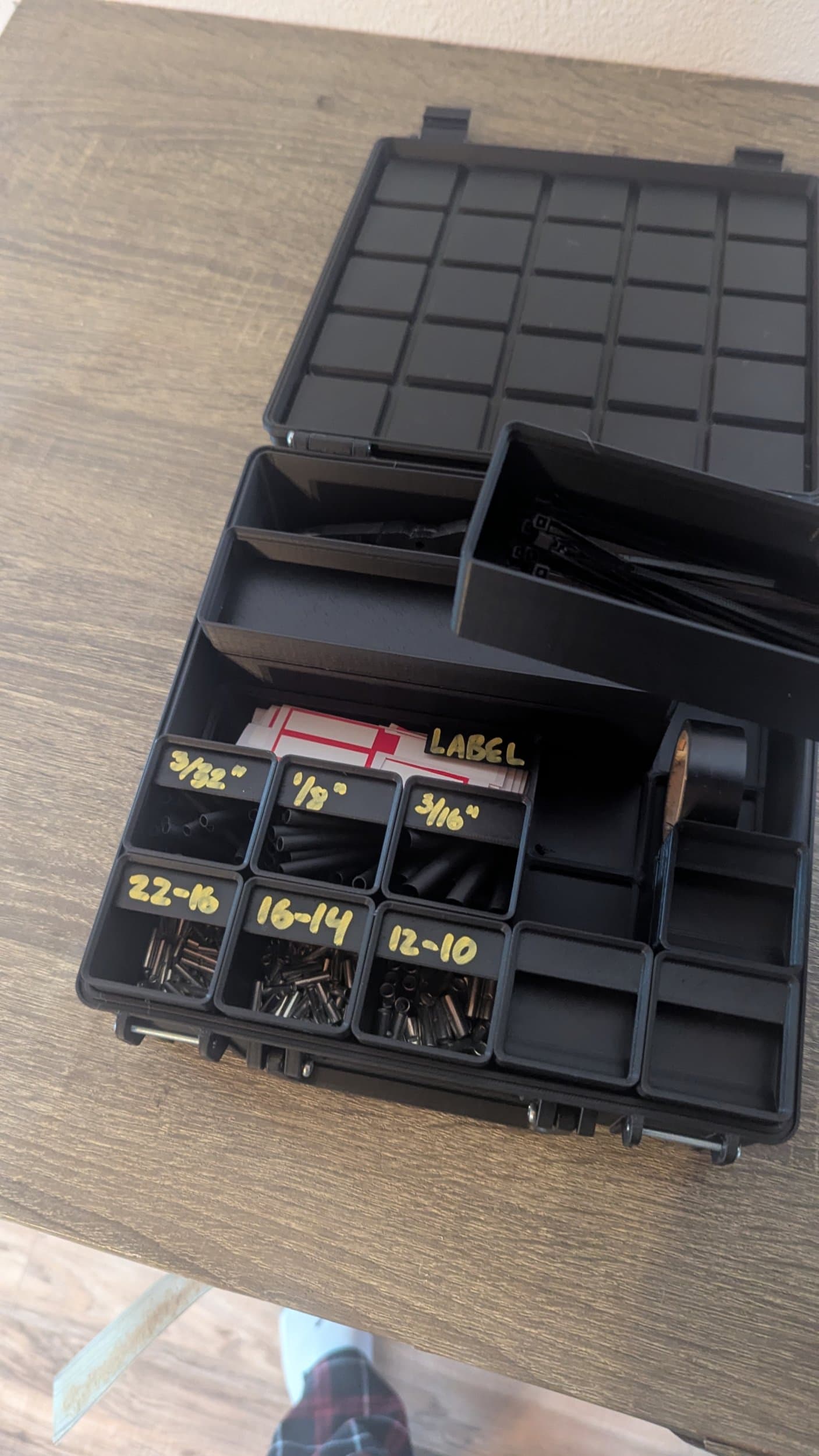 Open ↗I am stoked about my 3d printer mega organizer box for wiring junk so I'll share it I think to round it out I should upgrade to separate stripper/crimper tools, and add in a pen soldering iron and the junk to go with that. If I still have empty space after that maybe I will make a slightly smaller box